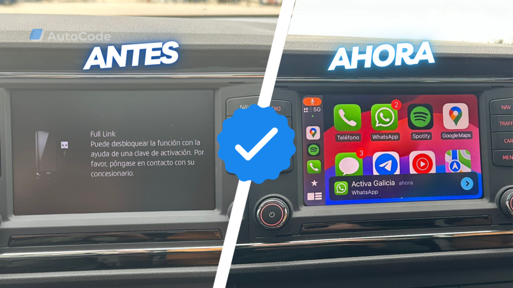 Con este servicio activamos Full Link de forma remota para que puedas disfrutar de Apple CarPlay o Android Auto directamente en la pantalla original de tu coche. Sin cables sueltos, sin modificaciones. Lo dejamos tal y como lo haría el concesionario, pero más rápido, sin esperas y desde la comodidad de tu casa.